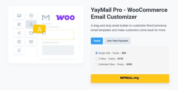 YayMail Pro is a premium WordPress plugin developed by YayCommerce, designed as a powerful WooCommerce email customizer to enhance transactional email templates. It offers a drag-and-drop interface, making it easy to create professional, branded emails without coding skills. Ideal for e-commerce stores, it allows customization of default WooCommerce email templates and supports integration with various third-party plugins, providing a seamless experience for managing email communications.